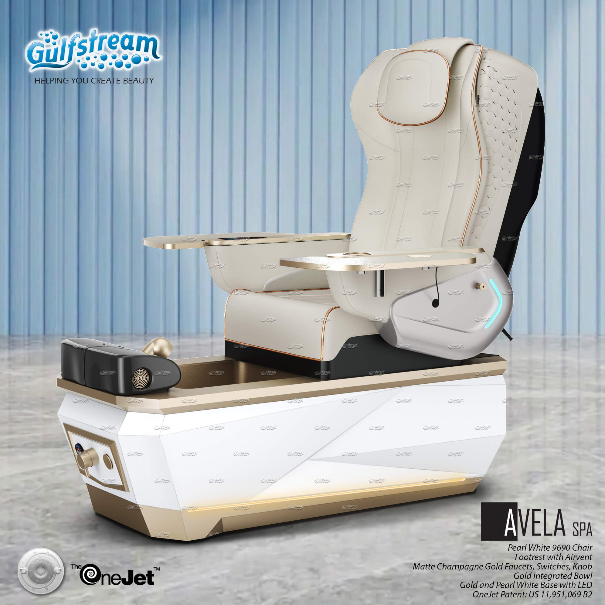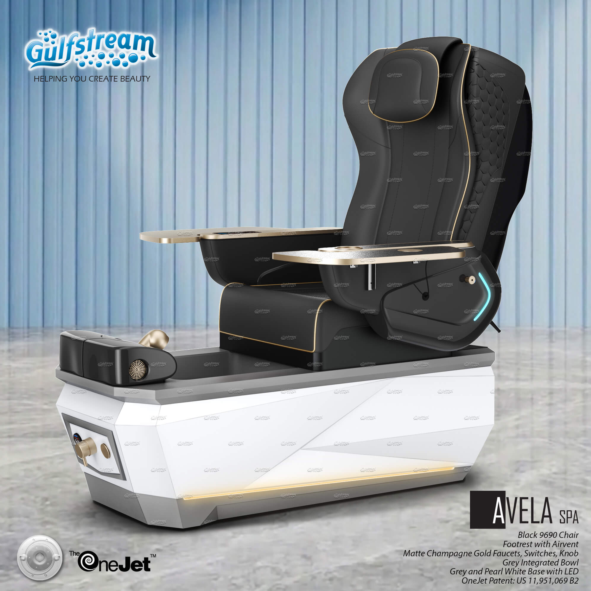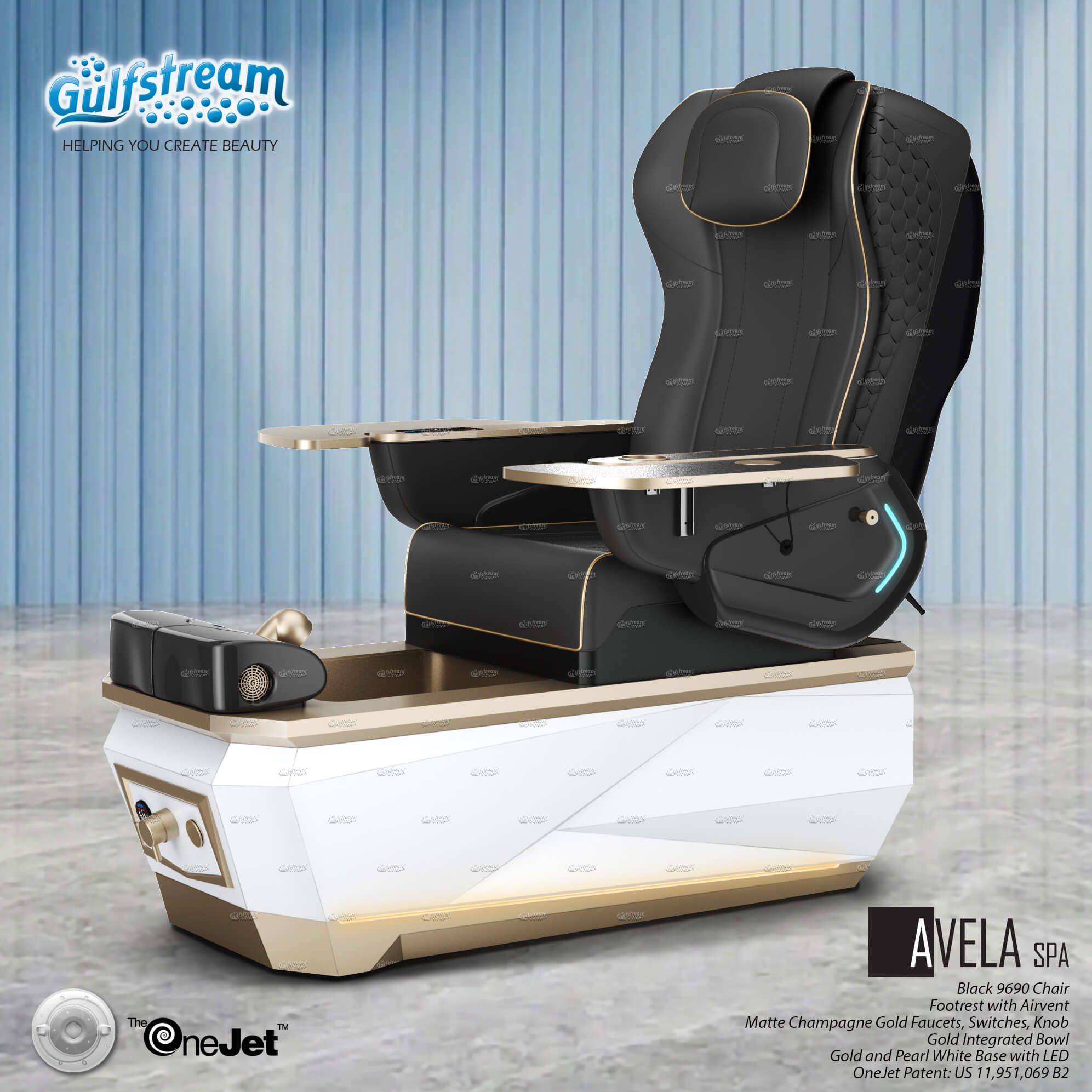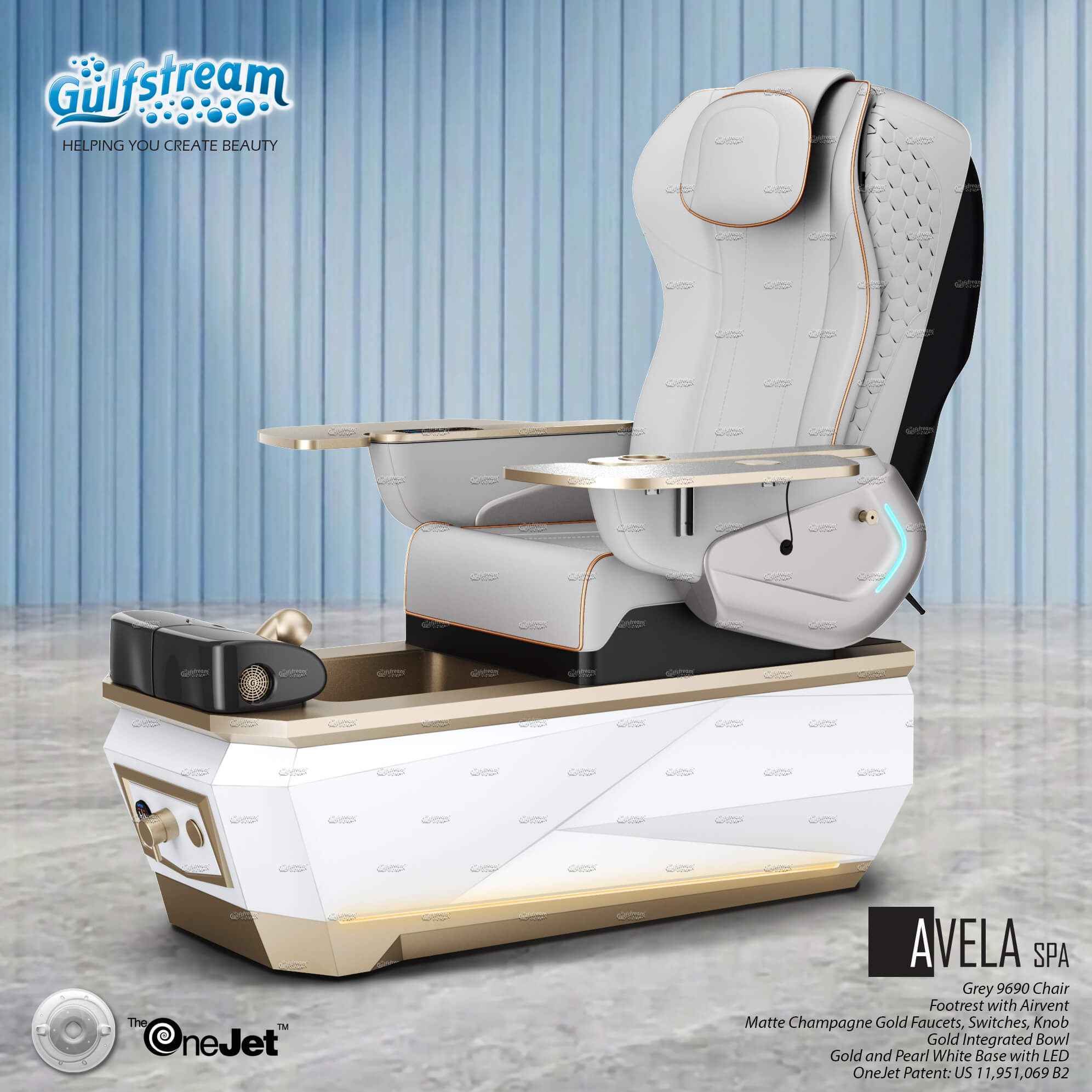 Featured in 2 classic base colourways, the Avela Spa allows salon customers to feel relaxed and rejuvenated with a clean integrated bowl, an all-around functional footrest with an optional integrated air vent, and high-quality matte gold fixtures. Feel confident in your salon with the Avela Spa.